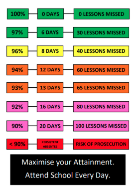 - Parents/carers may be subject to fines of up to £2,500 or imprisonment for failing to ensure their child's regular attendance at school.
