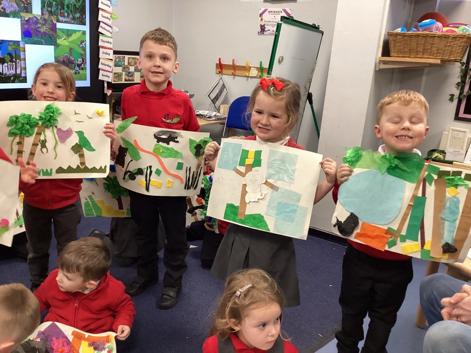 In Art, Owls have been learning how to draw jungle animals by following step-by-step instructions. Then they painted them using watercolours. In our Art Subject in the Spotlight event, the children worked collaboratively to create collages of jungles as a background to layer their animals onto.