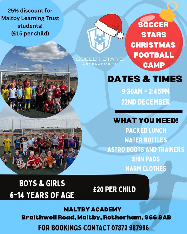 We are excited to announce that we will be running a Christmas Football camp in collaboration between Maltby Learning Trust and Soccer Stars Development! The camp will take place on Monday 22nd December and will run from 9:30am-2:45pm.